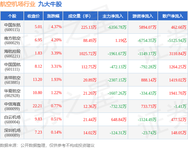 个股表现方面,航空机场行业当日领涨股为中国东航(600115),该股当日报收5.01,上涨4.37%,成交量225.13万,主力资金净流出6356.78万元。南方航空(600029)以上涨4.2%紧随其后,该股当日成交量88.49万,主力资金净流入1.19亿元。除此之外,海航控股(600221)、中国国航(601111)、吉祥航空(603885)均进入当日牛股之列。具体个股列表见下表: