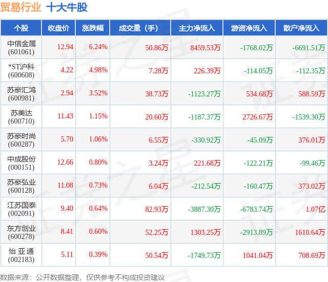个股表现方面,贸易行业当日领涨股为中信金属(601061),该股当日报收12.94,上涨6.24%,成交量50.86万,主力资金净流入8459.53万元。*ST沪科(600608)以上涨4.98%紧随其后,该股当日成交量7.28万,主力资金净流入226.39万元。除此之外,苏豪汇鸿(600981)、苏美达(600710)、苏豪时尚(600287)均进入当日牛股之列。具体个股列表见下表: