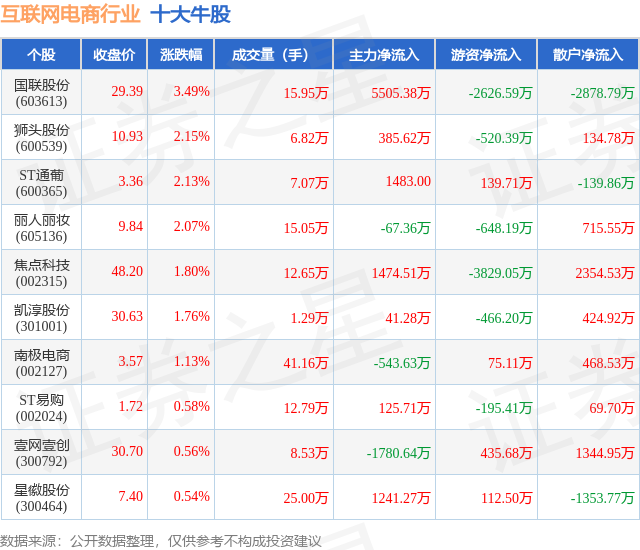 个股表现方面,互联网电商行业当日领涨股为国联股份(603613),该股当日报收29.39,上涨3.49%,成交量15.95万,主力资金净流入5505.38万元。狮头股份(600539)以上涨2.15%紧随其后,该股当日成交量6.82万,主力资金净流入385.62万元。除此之外,ST通葡(600365)、丽人丽妆(605136)、焦点科技(002315)均进入当日牛股之列。具体个股列表见下表: