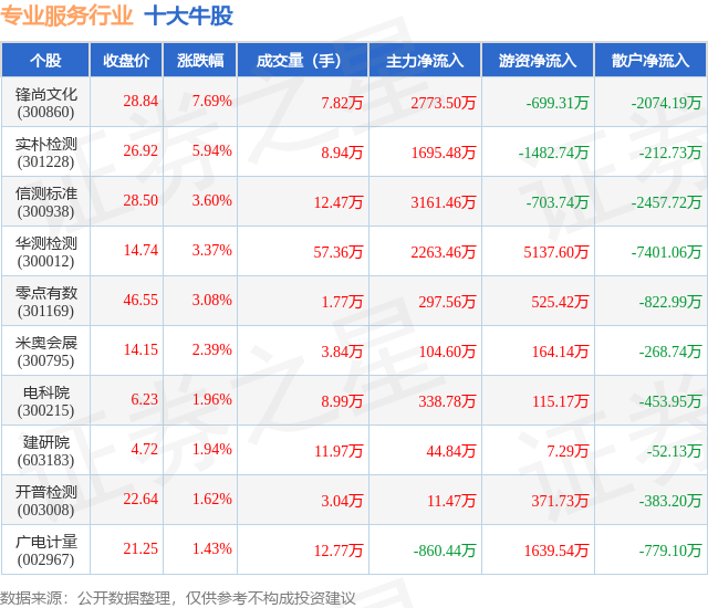 个股表现方面,专业服务行业当日领涨股为锋尚文化(300860),该股当日报收28.84,上涨7.69%,成交量7.82万,主力资金净流入2773.5万元。实朴检测(301228)以上涨5.94%紧随其后,该股当日成交量8.94万,主力资金净流入1695.48万元。除此之外,信测标准(300938)、华测检测(300012)、零点有数(301169)均进入当日牛股之列。具体个股列表见下表: