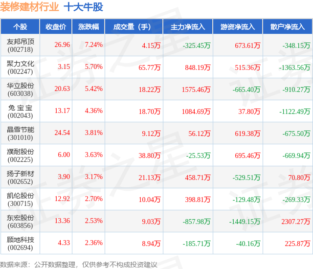 个股表现方面,装修建材行业当日领涨股为友邦吊顶(002718),该股当日报收26.96,上涨7.24%,成交量4.15万,主力资金净流出325.45万元。聚力文化(002247)以上涨5.7%紧随其后,该股当日成交量65.77万,主力资金净流入848.19万元。除此之外,华立股份(603038)、兔 宝 宝(002043)、晶雪节能(301010)均进入当日牛股之列。具体个股列表见下表: