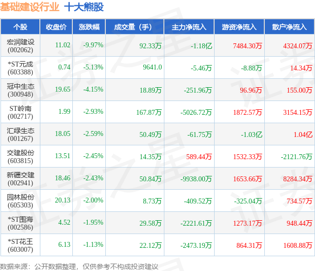 个股表现方面,基础建设行业当日领跌股为宏润建设(002062),该股当日报收11.02,下跌9.97%,成交量92.33万,主力资金净流出1.18亿元。*ST元成(603388)以下跌5.13%紧随其后,该股当日成交量9641.0,主力资金净流出5.46万元。除此之外,冠中生态(300948)、ST岭南(002717)、汇绿生态(001267)均进入当日熊股之列。具体个股列表见下表: