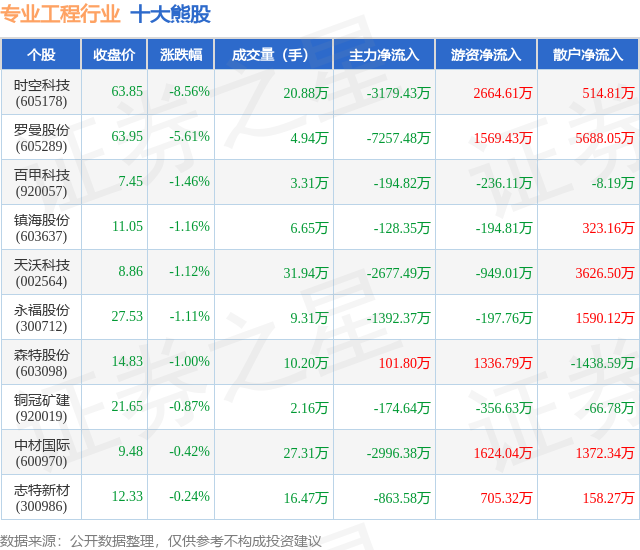 个股表现方面,专业工程行业当日领跌股为时空科技(605178),该股当日报收63.85,下跌8.56%,成交量20.88万,主力资金净流出3179.43万元。罗曼股份(605289)以下跌5.61%紧随其后,该股当日成交量4.94万,主力资金净流出7257.48万元。除此之外,百甲科技(920057)、镇海股份(603637)、天沃科技(002564)均进入当日熊股之列。具体个股列表见下表: