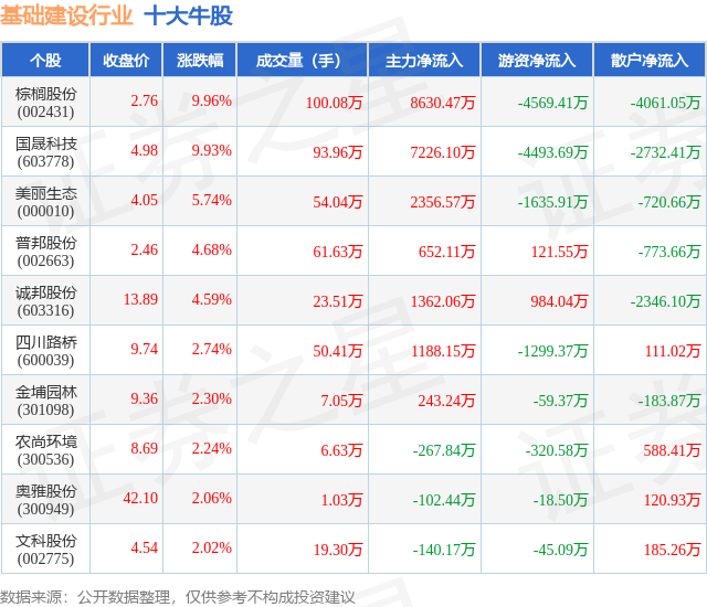 个股表现方面,基础建设行业当日领涨股为棕榈股份(002431),该股当日报收2.76,上涨9.96%,成交量100.08万,主力资金净流入8630.47万元。国晟科技(603778)以上涨9.93%紧随其后,该股当日成交量93.96万,主力资金净流入7226.1万元。除此之外,美丽生态(000010)、普邦股份(002663)、诚邦股份(603316)均进入当日牛股之列。具体个股列表见下表: