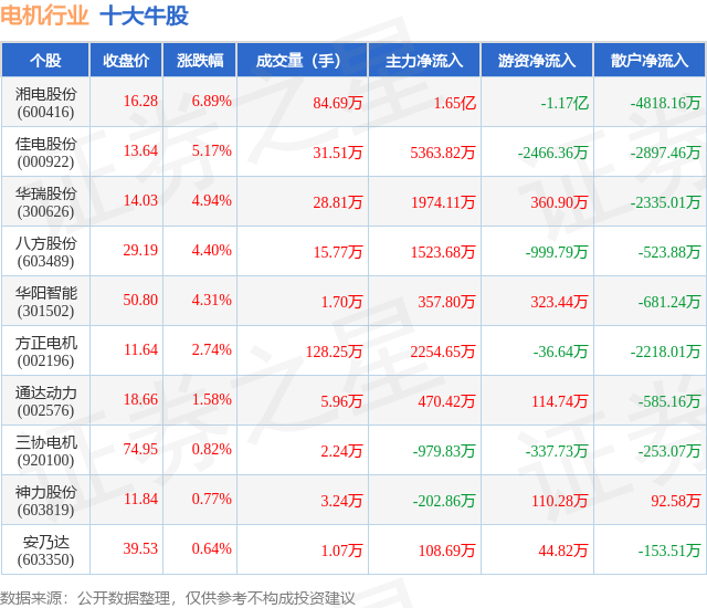 个股表现方面,电机行业当日领涨股为湘电股份(600416),该股当日报收16.28,上涨6.89%,成交量84.69万,主力资金净流入1.65亿元。佳电股份(000922)以上涨5.17%紧随其后,该股当日成交量31.51万,主力资金净流入5363.82万元。除此之外,华瑞股份(300626)、八方股份(603489)、华阳智能(301502)均进入当日牛股之列。具体个股列表见下表: