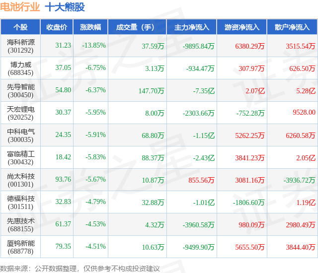 个股表现方面,电池行业当日领跌股为海科新源(301292),该股当日报收31.23,下跌13.85%,成交量37.59万,主力资金净流出9895.84万元。博力威(688345)以下跌6.75%紧随其后,该股当日成交量3.13万,主力资金净流出934.47万元。除此之外,先导智能(300450)、天宏锂电(920252)、中科电气(300035)均进入当日熊股之列。具体个股列表见下表: