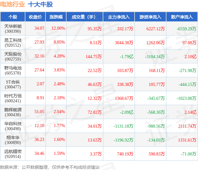 个股表现方面,电池行业当日领涨股为天华新能(300390),该股当日报收34.07,上涨12.0%,成交量95.35万,主力资金净流入332.17万元。昆工科技(920152)以上涨8.05%紧随其后,该股当日成交量8.51万,主力资金净流入3044.38万元。除此之外,天际股份(002759)、野马电池(605378)、ST合纵(300477)均进入当日牛股之列。具体个股列表见下表: