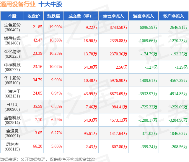 个股表现方面,通用设备行业当日领涨股为宝色股份(300402),该股当日报收21.85,上涨19.99%,成交量9.22万,主力资金净流入8743.5万元。博盈特焊(301468)以上涨16.36%紧随其后,该股当日成交量18.9万,主力资金净流入2339.88万元。除此之外,荣亿精密(920223)、中核科技(000777)、华丰股份(605100)均进入当日牛股之列。具体个股列表见下表: