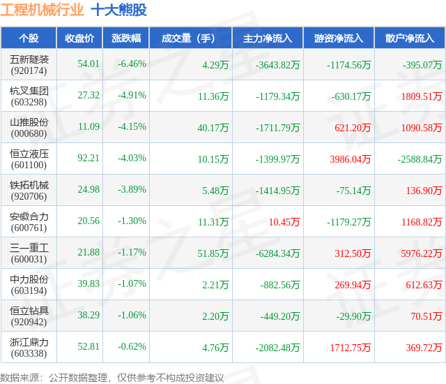 个股表现方面,工程机械行业当日领跌股为五新隧装(920174),该股当日报收54.01,下跌6.46%,成交量4.29万,主力资金净流出3643.82万元。杭叉集团(603298)以下跌4.91%紧随其后,该股当日成交量11.36万,主力资金净流出1179.34万元。除此之外,山推股份(000680)、恒立液压(601100)、铁拓机械(920706)均进入当日熊股之列。具体个股列表见下表: