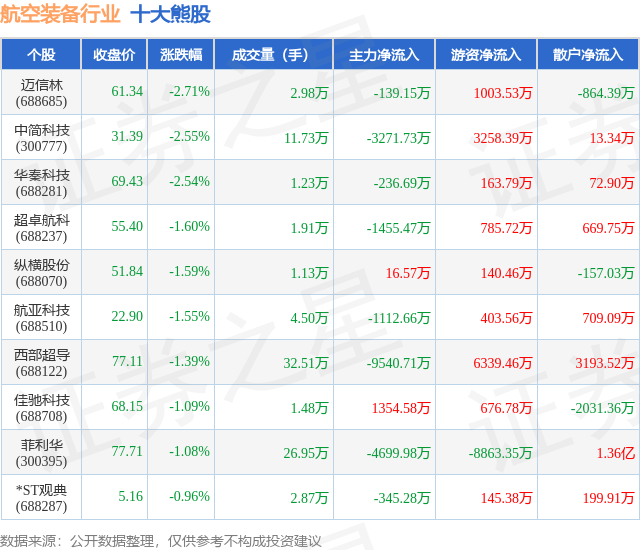 个股表现方面,航空装备行业当日领跌股为迈信林(688685),该股当日报收61.34,下跌2.71%,成交量2.98万,主力资金净流出139.15万元。中简科技(300777)以下跌2.55%紧随其后,该股当日成交量11.73万,主力资金净流出3271.73万元。除此之外,华秦科技(688281)、超卓航科(688237)、纵横股份(688070)均进入当日熊股之列。具体个股列表见下表:
