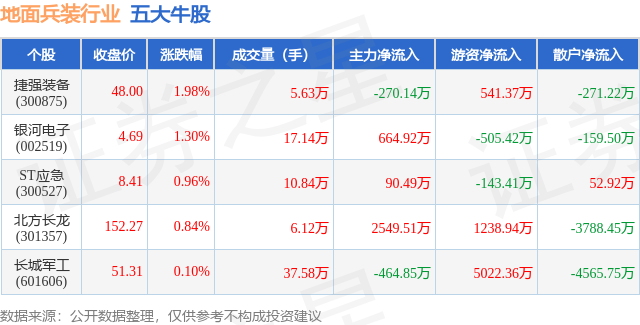 个股表现方面,地面兵装行业当日领涨股为捷强装备(300875),该股当日报收48.0,上涨1.98%,成交量5.63万,主力资金净流出270.14万元。银河电子(002519)以上涨1.3%紧随其后,该股当日成交量17.14万,主力资金净流入664.92万元。除此之外,ST应急(300527)、北方长龙(301357)、长城军工(601606)均进入当日牛股之列。具体个股列表见下表: