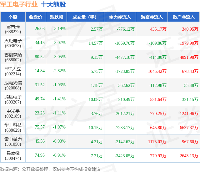 个股表现方面,军工电子行业当日领跌股为富吉瑞(688272),该股当日报收26.08,下跌3.19%,成交量2.57万,主力资金净流出776.12万元。火炬电子(603678)以下跌3.07%紧随其后,该股当日成交量14.57万,主力资金净流出1869.7万元。除此之外,睿创微纳(688002)、*ST大立(002214)、成电光信(920008)均进入当日熊股之列。具体个股列表见下表: