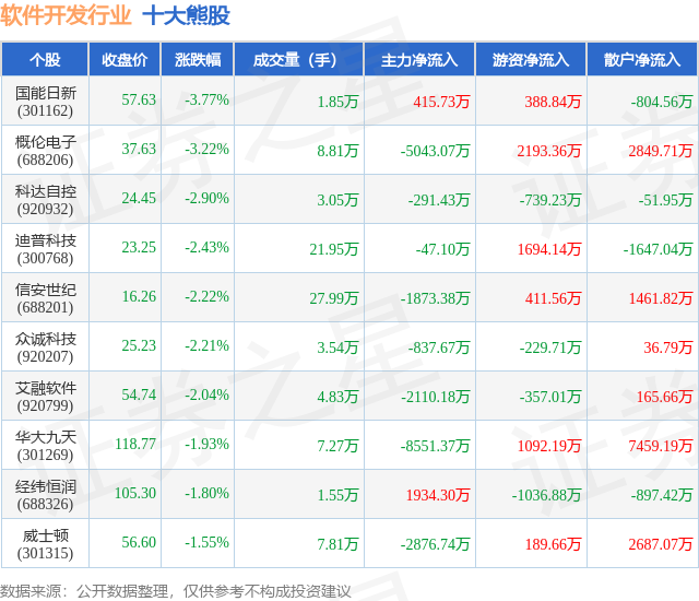 个股表现方面,软件开发行业当日领跌股为国能日新(301162),该股当日报收57.63,下跌3.77%,成交量1.85万,主力资金净流入415.73万元。概伦电子(688206)以下跌3.22%紧随其后,该股当日成交量8.81万,主力资金净流出5043.07万元。除此之外,科达自控(920932)、迪普科技(300768)、信安世纪(688201)均进入当日熊股之列。具体个股列表见下表: