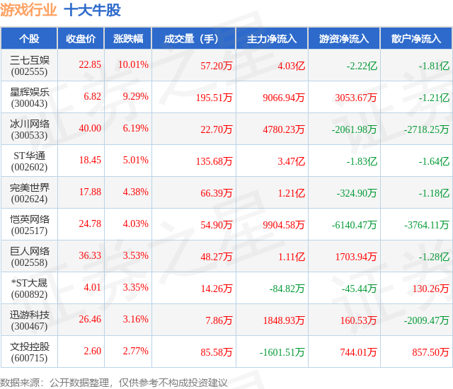 个股表现方面,游戏行业当日领涨股为三七互娱(002555),该股当日报收22.85,上涨10.01%,成交量57.2万,主力资金净流入4.03亿元。星辉娱乐(300043)以上涨9.29%紧随其后,该股当日成交量195.51万,主力资金净流入9066.94万元。除此之外,冰川网络(300533)、ST华通(002602)、完美世界(002624)均进入当日牛股之列。具体个股列表见下表: