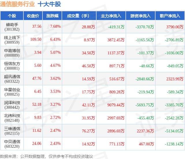 个股表现方面,通信服务行业当日领涨股为蜂助手(301382),该股当日报收37.56,上涨7.68%,成交量28.88万,主力资金净流出419.31万元。线上线下(300959)以上涨6.43%紧随其后,该股当日成交量8.97万,主力资金净流入3872.45万元。除此之外,中嘉博创(000889)、恒信东方(300081)、超讯通信(603322)均进入当日牛股之列。具体个股列表见下表: