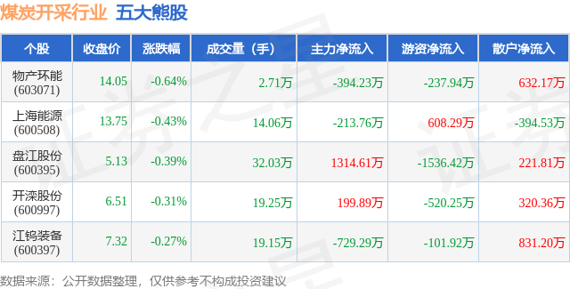 个股表现方面,煤炭开采行业当日领跌股为物产环能(603071),该股当日报收14.05,下跌0.64%,成交量2.71万,主力资金净流出394.23万元。上海能源(600508)以下跌0.43%紧随其后,该股当日成交量14.06万,主力资金净流出213.76万元。除此之外,盘江股份(600395)、开滦股份(600997)、江钨装备(600397)均进入当日熊股之列。具体个股列表见下表:
