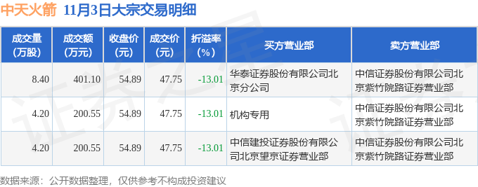 证券之星消息,11月3日中天火箭发生大宗交易,交易数据如下: