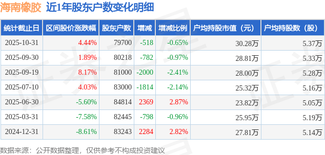 从股价来看,2025年9月30日至2025年10月31日,海南橡胶区间涨幅为4.44%,在此期间股东户数减少518.0户,减幅为0.65%。