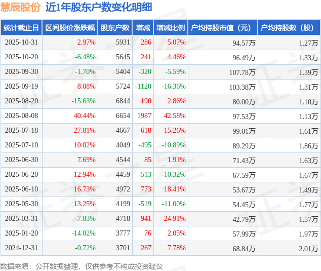 从股价来看,2025年10月20日至2025年10月31日,慧辰股份区间涨幅为2.97%,在此期间股东户数增加286.0户,增幅为5.07%。