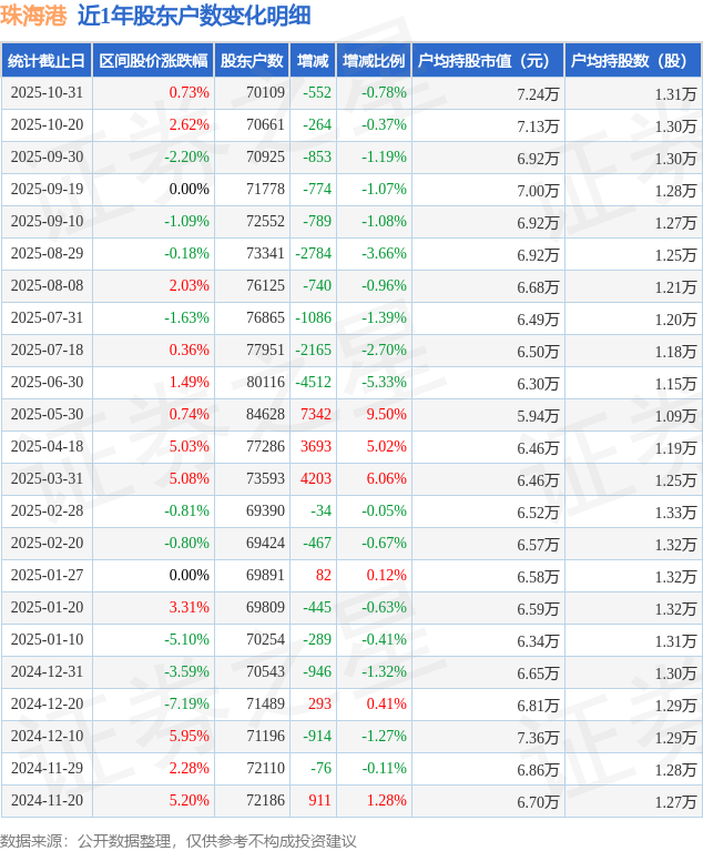从股价来看,2025年10月20日至2025年10月31日,珠海港区间涨幅为0.73%,在此期间股东户数减少552.0户,减幅为0.78%。