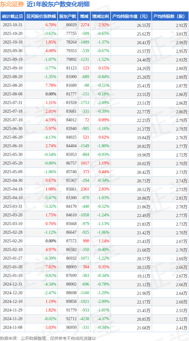 证券之星消息,近日东北证券披露,截至2025年10月31日公司股东户数为8.0万户,较10月20日增加2274.0户,增幅为2.92%。户均持股数量由上期的3.01万股减少至2.92万股,户均持股市值为26.55万元。