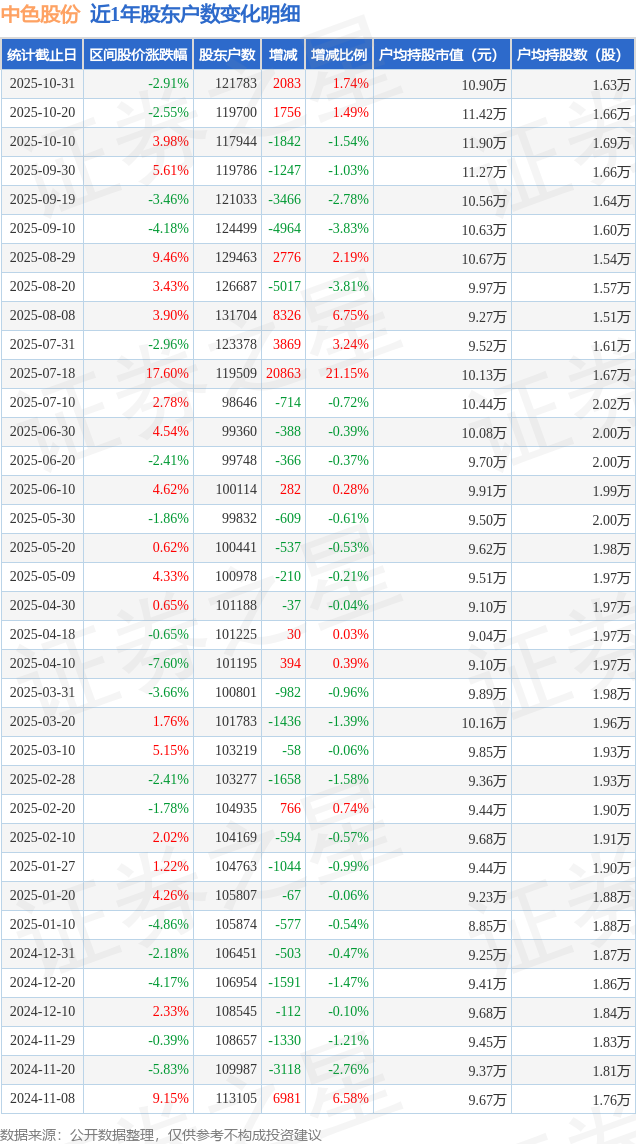 从股价来看,2025年10月20日至2025年10月31日,中色股份区间跌幅为2.91%,在此期间股东户数增加2083.0户,增幅为1.74%。