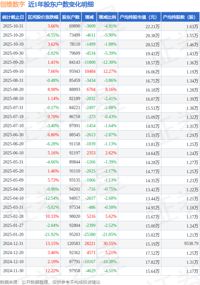 从股价来看,2025年10月20日至2025年10月31日,创维数字区间涨幅为3.66%,在此期间股东户数减少3609.0户,减幅为4.91%。