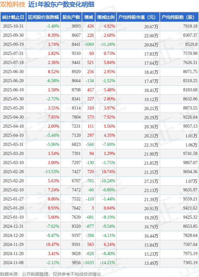 从股价来看,2025年9月30日至2025年10月31日,双枪科技区间跌幅为1.4%,在此期间股东户数增加426.0户,增幅为4.92%。