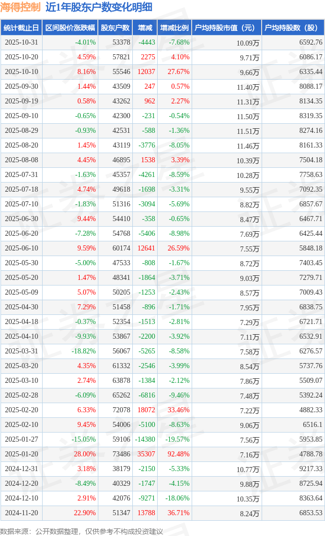从股价来看,2025年10月20日至2025年10月31日,海得控制区间跌幅为4.01%,在此期间股东户数减少4443.0户,减幅为7.68%。