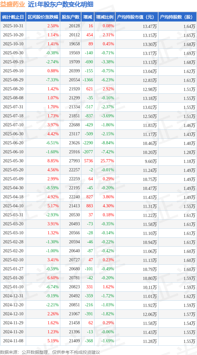 从股价来看,2025年10月20日至2025年10月31日,益盛药业区间涨幅为2.5%,在此期间股东户数增加16.0户,增幅为0.08%。