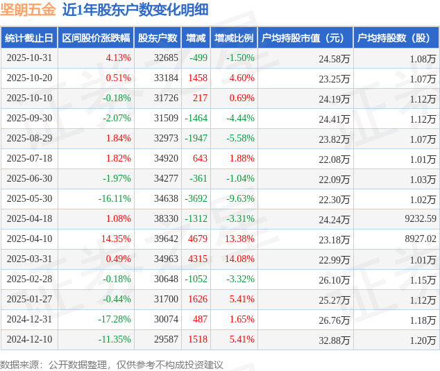 从股价来看,2025年10月20日至2025年10月31日,坚朗五金区间涨幅为4.13%,在此期间股东户数减少499.0户,减幅为1.5%。
