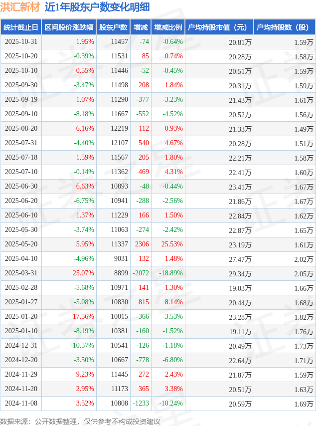 从股价来看,2025年10月20日至2025年10月31日,洪汇新材区间涨幅为1.95%,在此期间股东户数减少74.0户,减幅为0.64%。