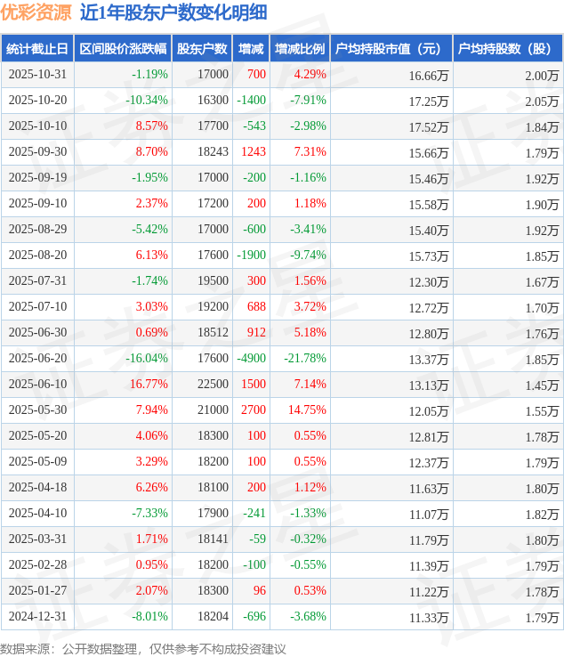 从股价来看,2025年10月20日至2025年10月31日,优彩资源区间跌幅为1.19%,在此期间股东户数增加700.0户,增幅为4.29%。