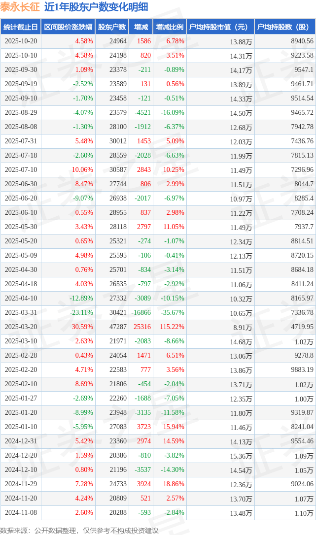 从股价来看,2025年9月30日至2025年10月20日,泰永长征区间涨幅为4.58%,在此期间股东户数增加1586.0户,增幅为6.78%。