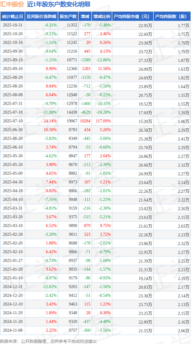 从股价来看,2025年10月20日至2025年10月31日,汇中股份区间跌幅为0.31%,在此期间股东户数减少170.0户,减幅为1.48%。