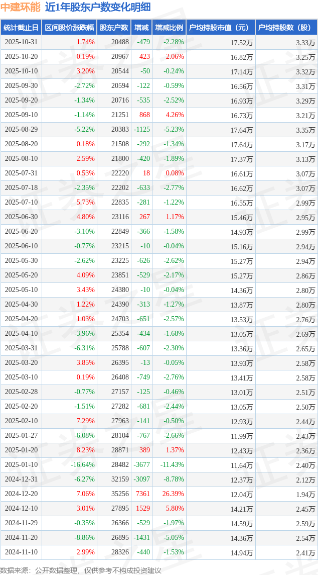 从股价来看,2025年10月20日至2025年10月31日,中建环能区间涨幅为1.74%,在此期间股东户数减少479.0户,减幅为2.28%。