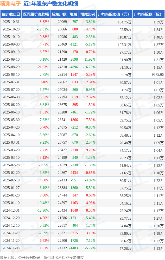 从股价来看,2025年10月20日至2025年10月31日,精测电子区间涨幅为8.82%,在此期间股东户数减少797.0户,减幅为3.82%。