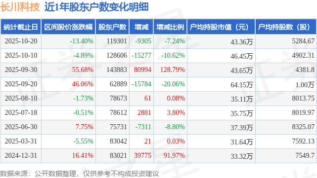 从股价来看,2025年10月10日至2025年10月20日,长川科技区间跌幅为13.4%,在此期间股东户数减少9305.0户,减幅为7.24%。