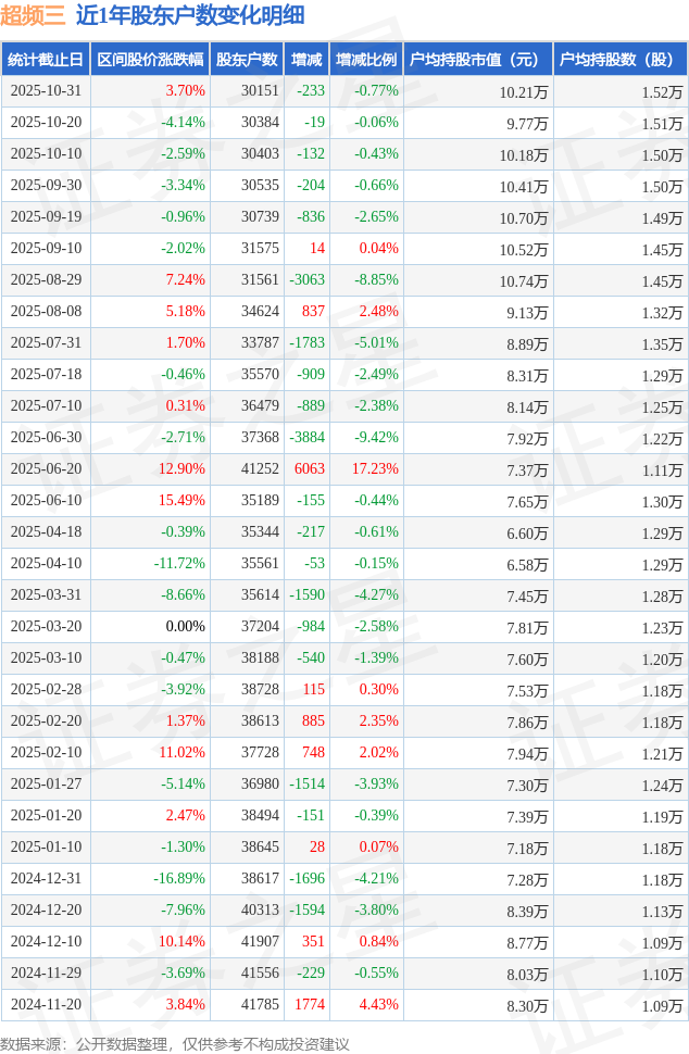 从股价来看,2025年10月20日至2025年10月31日,超频三区间涨幅为3.7%,在此期间股东户数减少233.0户,减幅为0.77%。