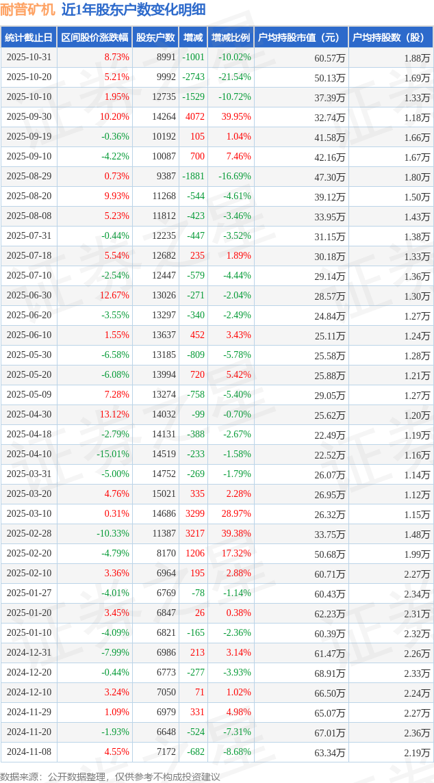 从股价来看,2025年10月20日至2025年10月31日,耐普矿机区间涨幅为8.73%,在此期间股东户数减少1001.0户,减幅为10.02%。