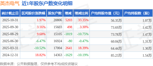 从股价来看,2025年9月30日至2025年10月31日,英杰电气区间涨幅为1.97%,在此期间股东户数增加5203.0户,增幅为33.35%。