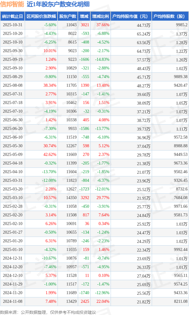 从股价来看,2025年10月20日至2025年10月31日,信邦智能区间跌幅为5.6%,在此期间股东户数增加3021.0户,增幅为37.66%。