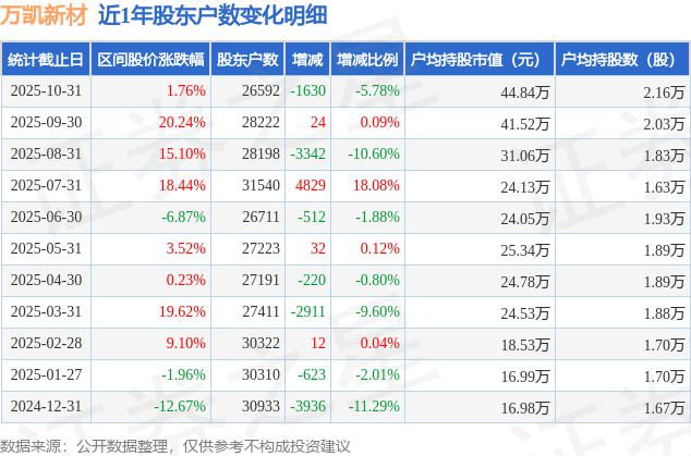 从股价来看,2025年9月30日至2025年10月31日,万凯新材区间涨幅为1.76%,在此期间股东户数减少1630.0户,减幅为5.78%。