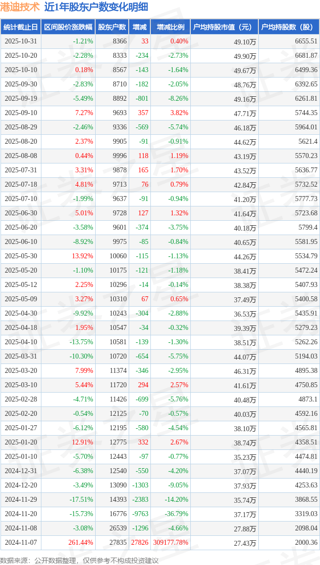 从股价来看,2025年10月20日至2025年10月31日,港迪技术区间跌幅为1.21%,在此期间股东户数增加33.0户,增幅为0.4%。
