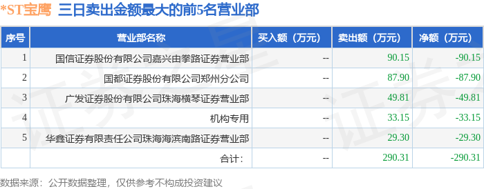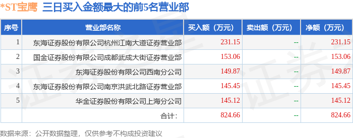 证券之星消息,沪深交易所2025年11月3日公布的交易公开信息显示,*ST宝鹰(002047)因连续三个交易日内,涨幅偏离值累计达到12%的ST证券、*ST证券和未完成股改证券登上龙虎榜。此次是近5个交易日内第2次上榜。