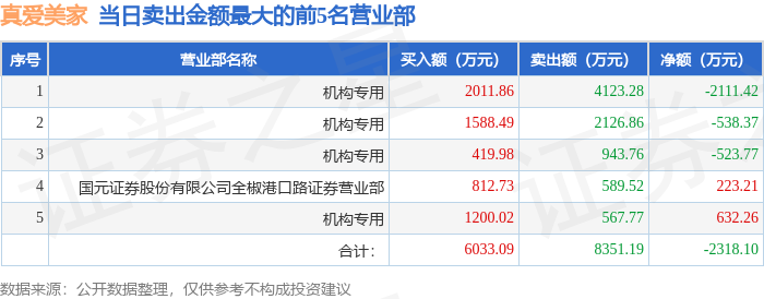 证券之星消息,沪深交易所2025年11月3日公布的交易公开信息显示,真爱美家(003041)因日振幅值达到15%的前5只证券登上龙虎榜。此次是近5个交易日内第1次上榜。