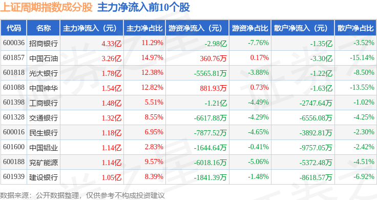 资金流向方面,上证周期(000063)指数成份股当日主力资金净流出合计22.24亿元,游资资金净流出合计2.27亿元,散户资金净流入合计24.51亿元。成份股资金流向详情见下表: