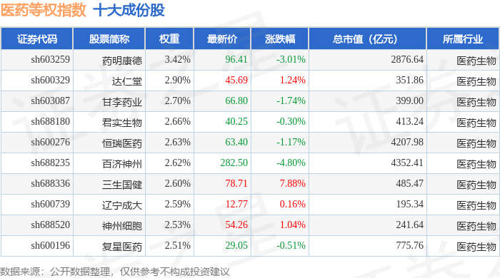 证券之星消息,11月3日,医药等权(000075)指数报收于7465.74点,涨0.27%,成交277.33亿元,换手率1.2%。当日该指数成份股中,上涨的有30家,三生国健以7.88%的涨幅领涨,下跌的有19家,百济神州以4.8%的跌幅领跌。