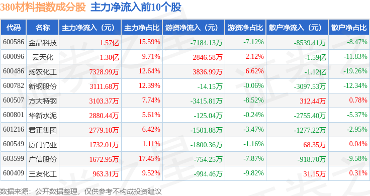 资金流向方面,380材料(000105)指数成份股当日主力资金净流出合计5.14亿元,游资资金净流入合计7484.57万元,散户资金净流入合计4.39亿元。成份股资金流向详情见下表: