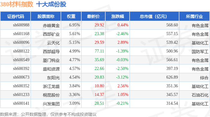 证券之星消息,11月3日,380材料(000105)指数报收于5073.95点,涨0.11%,成交276.44亿元,换手率2.14%。当日该指数成份股中,上涨的有27家,金晶科技以7.43%的涨幅领涨,下跌的有22家,东阳光以3.12%的跌幅领跌。